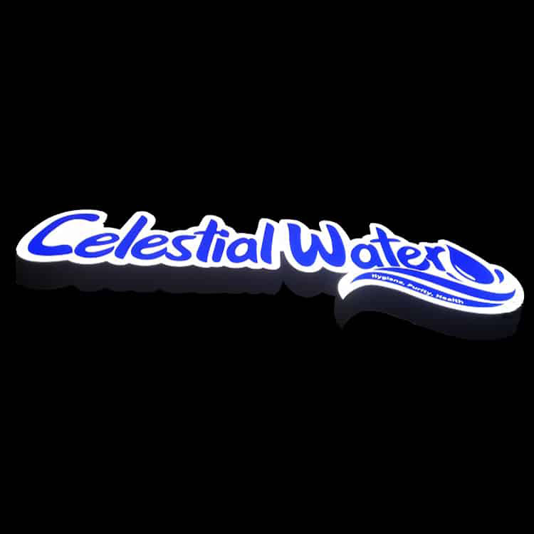 Each store need a store front lit signage board to tell people your brand and store name. This is the first step to start business. FastMetalSign will give you professional advise on making wonderful store front signage. It could be front lit channel letter, reverse channel letter, dual-lit channel letter, cabinet light box or else dimensional lettering. Water Celestial advertising signage board with stainless steel frame, 10mm A grade PVC board, 3 mm white color acrylic board, the blue part are translucent film. The translucent film make the light box or channel letter be attractive on two or more different color logo.